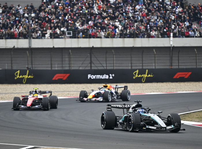 3月15日,梅赛德斯车队英国车手拉塞尔(前)在比赛中。新华社记者 陈浩明 摄赛事文化正深度融入城市肌理,让F1元素遍布申城街头。上海北外滩“格子旗嘉年华”精心打造滨江艺术长廊,黄浦区在南京路步行街设立赛车主题快闪区,让市民游客在休闲逛街之余,就能近距离感受赛车运动的魅力。